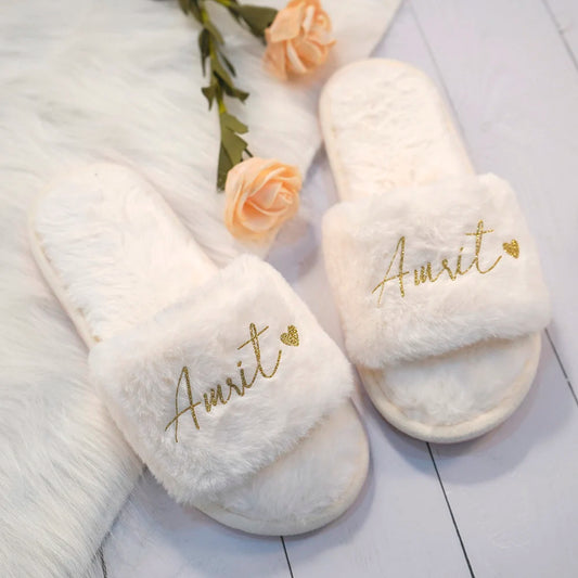Customized Fluffy Slippers Wedding Bachelorette Party Gift Bridesmaid Open Toe Slippers Indoor Party Shoes Spa Plush Slippers